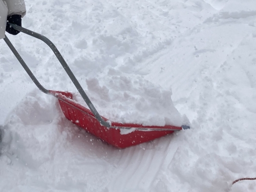 スノーダンプとは、大型の角型シャベルにパイプの持ち手が付いたような形状で、ソリのように雪を押して運ぶことができる除雪用具のこと。