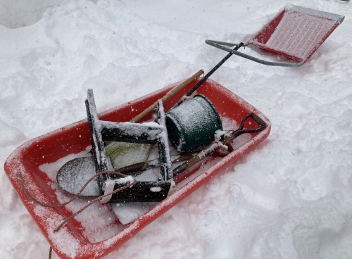 スコップ、ケレン棒、ナタ、バケツ、はしご(大・小)、スノーダンプ、ほうき、ソリ・・・と、借りられるものは全て借りるという感じだった。