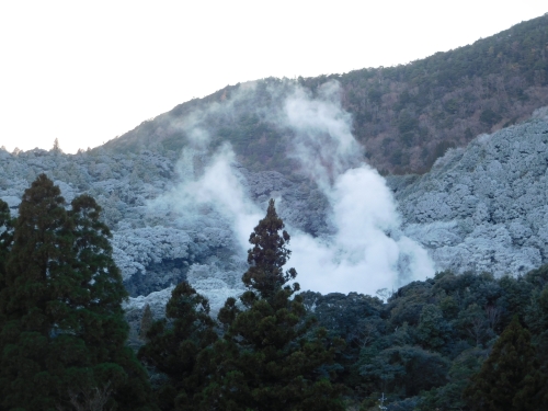 とても温泉地らしい光景ではあるが、一つ気になったのは煙が上がる一帯の木の葉の色が白っぽかったということ。