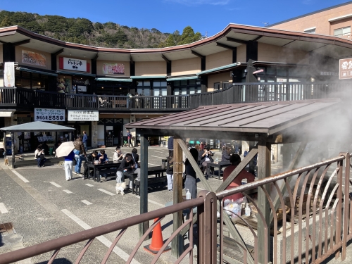 また広場には、温泉の蒸気で蒸した卵やトウモロコシを販売する屋台があり、テーブル席で食事している人たちの姿が見られた。