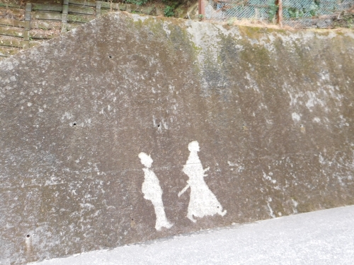 更に坂を登って行くと、擁壁に、男女ふたりが歩く姿が描かれていた。