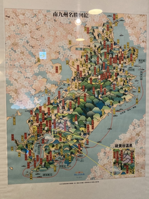 ホテルの説明によると、江戸時代の「諸国温泉効能鑑」と題する番付表には、「薩摩霧島湯」が「うちみに良し」として西方の前頭6番目に、「万能に良し」として「薩摩硫黄湯」が13枚目に付出されていたらしい。
