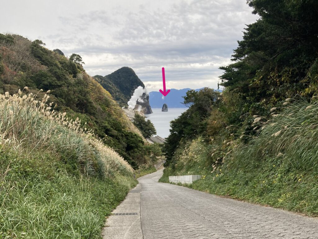 更に道を下って行くと、海が間近に見えてきて、波打つ海から黒っぽい岩肌が露出していた。