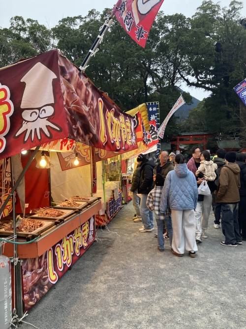 赤い鳥居をくぐってみると、たこ焼き屋や鯛焼き屋などの屋台がたくさん出ていて、参拝客で賑わっていた。
