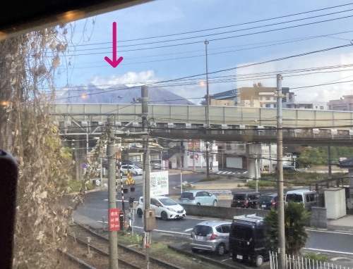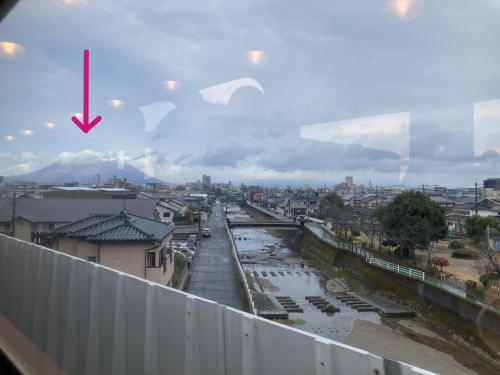 電車が鹿児島中央駅に近づくにつれ、雨足が弱まってきて、桜島がくっりと顔を出していた。