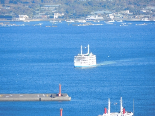 澄んだ青い海には、桜島と鹿児島市を結ぶ白い桜島フェリーが行き交う様子も見てとれた(「鹿児島旅行!(7.桜島うどん♪)」)。